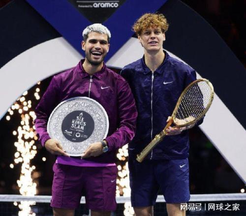 我们再来关注沙特的六王大满贯表演赛。北京时间今晨,六王表演赛精彩落幕,世界第二辛纳以6-2 6-4完胜世界第一阿尔卡拉斯,连续两年战胜同一对手,再次夺冠,把600万美元的奖金和一把纯金球拍收入囊中。