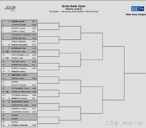 维也纳站:辛纳、兹维列夫、德米纳尔、穆塞蒂位列前四种子。俄罗斯三雄卡恰诺夫、梅德维德夫、卢布列夫也将出战。