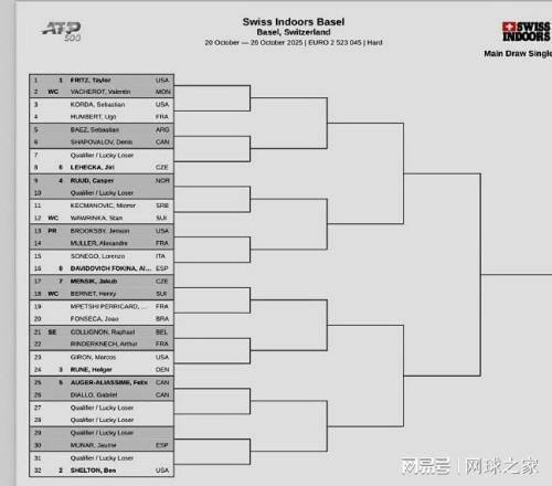 我们再来关注下周赛事。北京时间昨晚,两站ATP500和一站WTA500赛相继公布了正赛签表。巴塞尔站:弗里茨、谢尔顿、鲁德领衔出战。弗里茨首轮将迎战新科上海大师赛冠军瓦舍罗。